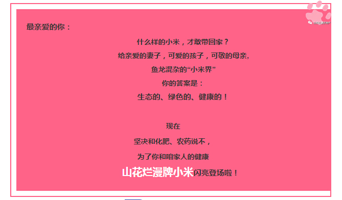 為了咱家人的健康,興縣山花爛漫牌小米只施天然有機(jī)肥,決不讓一粒化肥進(jìn)農(nóng)田,絕不使用殺蟲(chóng)劑、除草劑,人工種植、人工除草、人工收割,24小時(shí)追溯系統(tǒng)管理,粒粒小米精選,高品質(zhì)的保證!